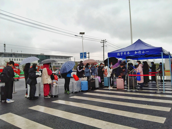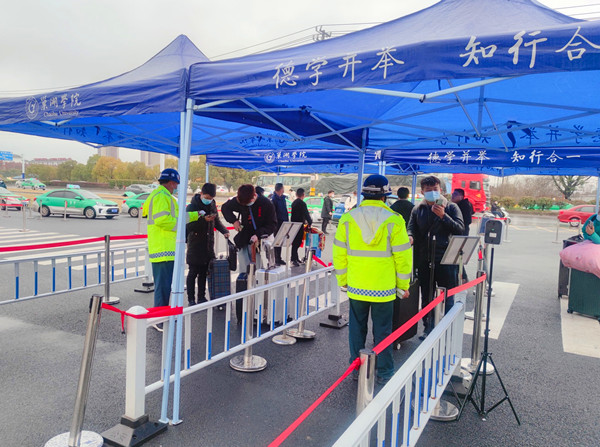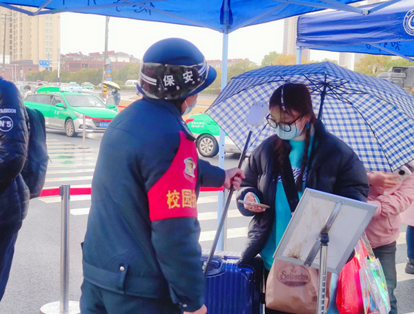 3月1日至2日,返校学生在工作人员引导下,按照流程有序报到。学生从学校新大门西侧入口排队进入,出示返校审批和健康码,进行体温检测,并在学院报到点登记,经宿舍管理人员第二次体温检测正常后方可进入宿舍。