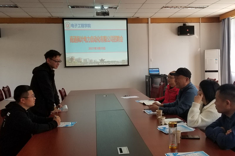 为拓宽毕业生就业渠道,3月25日上午,电子工程学院在院会议室举办南通枫叶电力自动化有限公司专场招聘会。招聘会由学院党委副书记孔鲲鹏主持,毕业班辅导员和电气工程及其自动化专业、电子科学与技术专业毕业生参加。