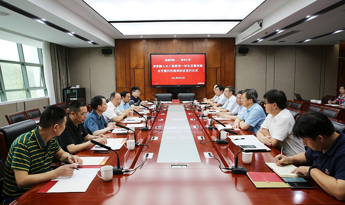 徐守坤和徐柳凡代表双方签订两校《深度融入长三角教育一体化发展战略合作意向性框架协议》。签约仪式后,双方对口部门负责人进行了一对一地深入交流。随后,在徐守坤陪同下,祝家贵一行还考察了常州大学产业学院和红色教育基地。