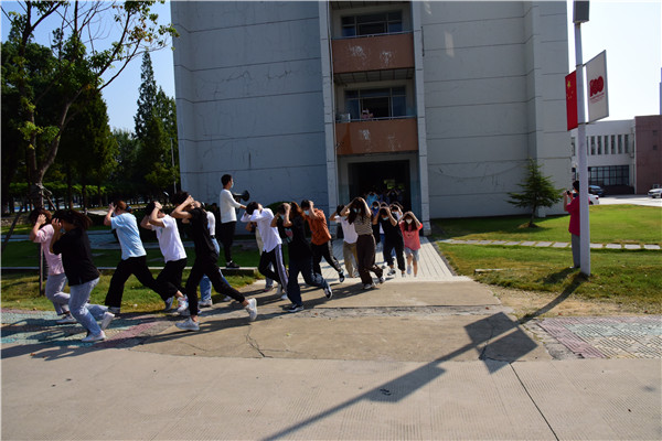 上午9时18分,防空警报响起,地震、消防应急疏散演练活动正式开始。演练区域博学楼与慎思楼各楼层引导员立即告知学生“地震来了,不要慌”,指挥学生迅速抱头、下蹲,躲在各自的课桌旁,蜷曲身体,降低重心,并用书本保护头部,降低可能由重物砸中造成的伤害。
