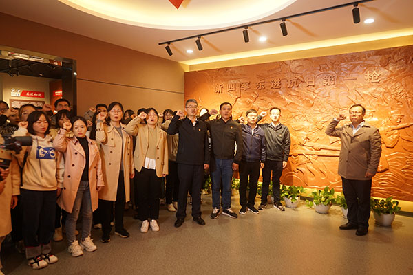 三胜村党群服务中心公园矗立着一座铜铸英雄像,由叶飞将军亲笔题写的“蒋家河口战斗遗址”八个大字熠熠生辉。1938年5月12日,蒋家河口战斗打响了新四军东进抗日的第一枪,此战的胜利极大鼓舞了军心民心,在抗战历史上具有重要意义。纪念馆分为日寇侵华、东进初捷、红色银屏等七个板块,大家在讲解员的介绍下回顾了那段艰苦卓绝的奋斗历程,深切感受到中国共产党带领的军民团结一致、共御外侮的伟大爱国主义情怀。