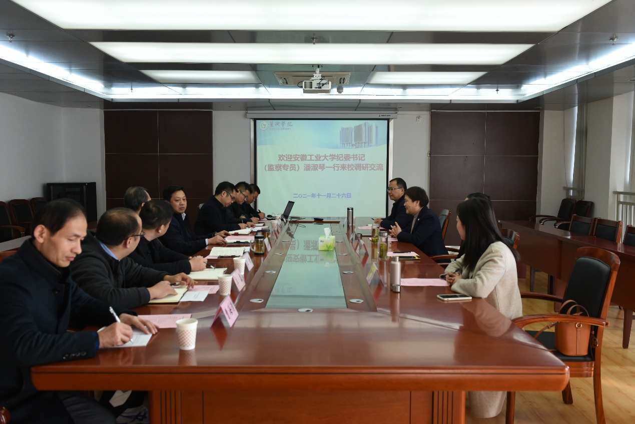 11月26日上午,安徽工业大学党委常委、纪委书记、监察专员潘淑琴、纪委办主任叶凤华、纪委办副主任杨卫兵、监督检查科副科长徐蕊一行4人来校调研纪检监察和校内巡察工作。校党委书记周峰会见了潘淑琴一行。校纪委书记、监察专员路顺主持调研座谈会。纪委办主任刘洪涛、党委巡察办主任陈海波、纪委办副主任汪泰及有关人员参会。