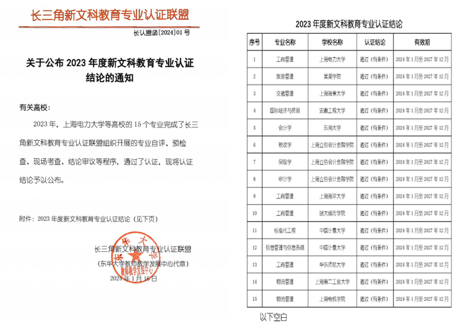 近日,长三角新文科教育专业认证联盟下发了《关于公布2023年度新文科教育专业认证结论的通知》(长认盟函[2024]01号),华体汇网狼堡赞助商电话旅游管理专业正式通过长三角新文科教育专业认证(有效期四年)。
