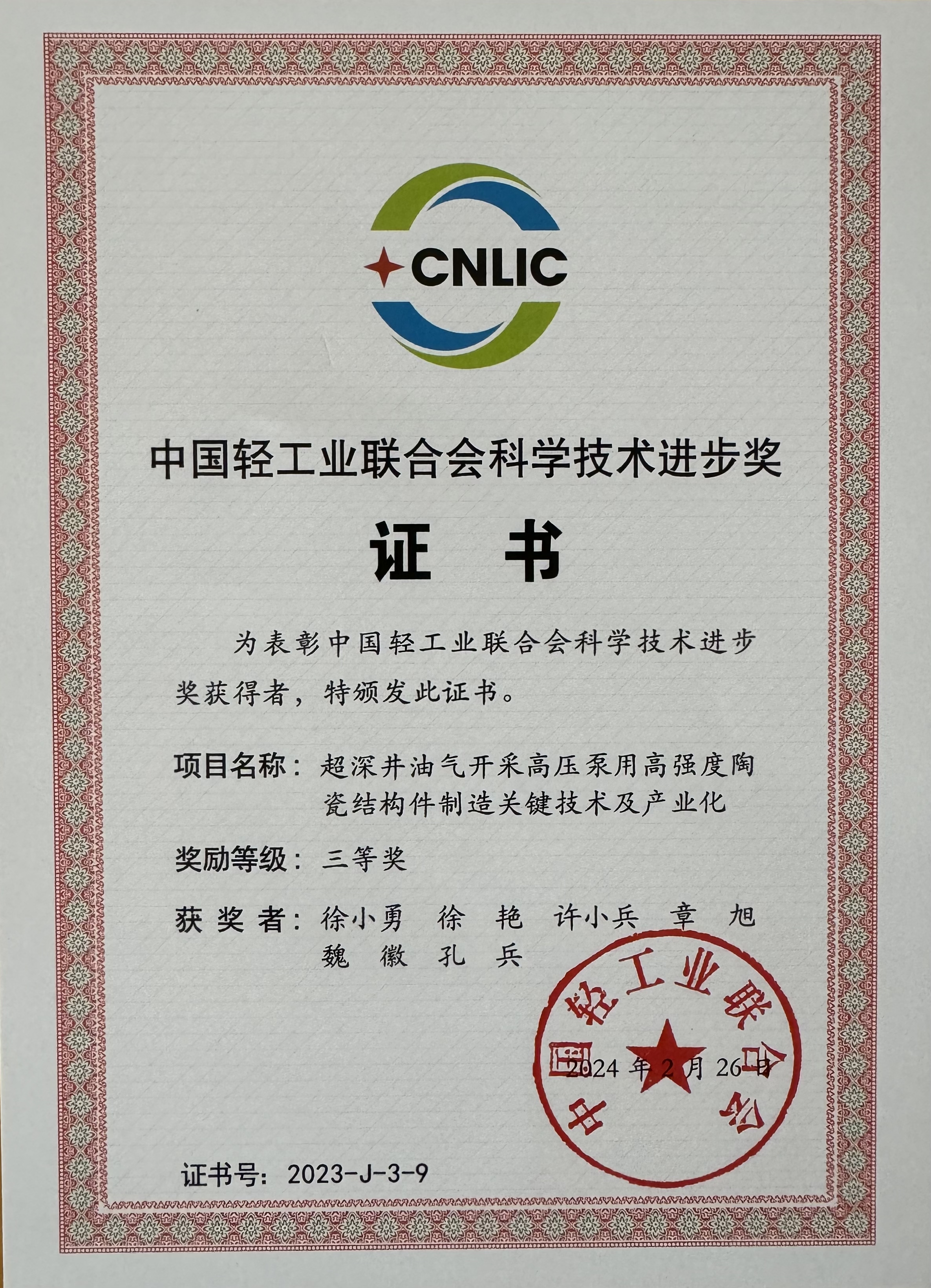 2024年4月8日,中国轻工业联合会五届四次、中华全国手工业合作总社八届四次理事会在四川广元召开,会上宣布了《关于2023年度中国轻工业联合会科学技术奖励的决定》并举行颁奖仪式,华体汇网狼堡赞助商电话功能陶瓷粉体材料与器件科研创新团队研究成果“超深井油气开采高压泵用高强度陶瓷结构件制造关键技术及产业化”喜获中国轻工业联合会科技进步奖三等奖。