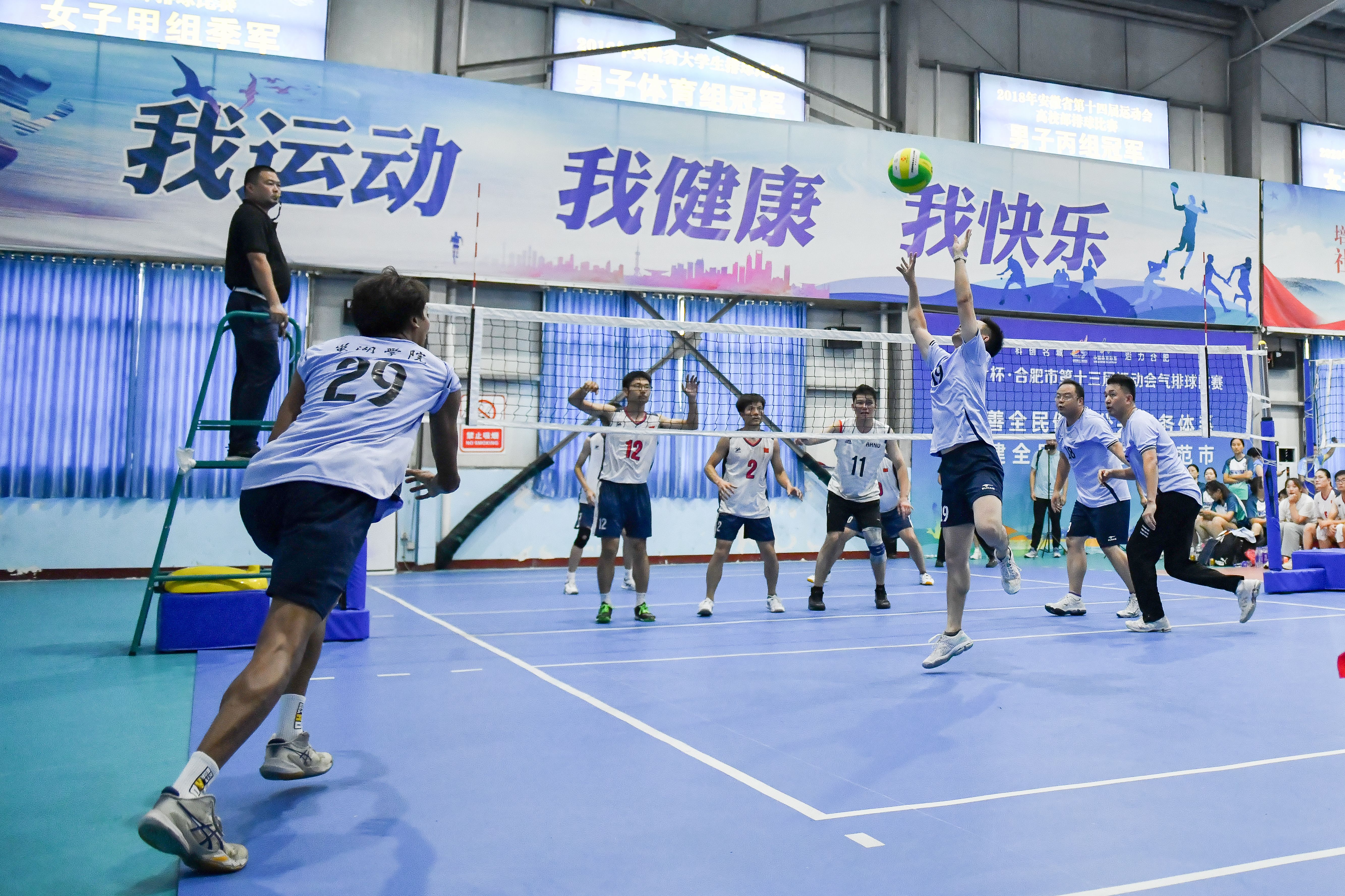 比赛现场,来自中国科学技术大学、合肥工业大学、安徽大学、安徽师范大学、安徽农业大学等高校的运动员们斗志昂扬,尽情释放激情、挥洒汗水。精彩的对抗、倒地救球、飞身扣杀、齐心拦防等精彩瞬间,展现了竞技体育的独特魅力,也点燃了现场观众的热情。掌声和呐喊声此起彼伏,为运动员们加油助威。