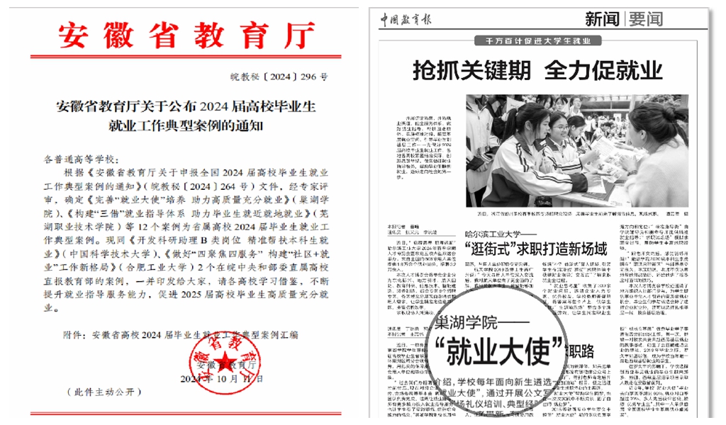 致力“筑梦、圆梦”,促进毕业生高质量充分就业。一是筑梦启航,加强生涯规划与就业指导。突出就业优先导向,形成“一把手”负责,就业指导中心统筹,工作专班主抓,职能部门联动,二级学院人人参与的全员工作矩阵。创建“指南针”就业创业指导名师工作室,选派教师参加校外就业创业师资培训;组建“就业大使”学生团队,引导学生全流程参与“促就业攻坚行动”。依托“扬帆”大学生职业生涯规划月、“启航”就业创业指导服务月为主要载体,打造就业创业教育品牌化载体,共同营造“全员全过程全方位”就业育人的良好局面。二是圆梦未来,提升学生就业质量。聚焦学校“地方性、应用型”办学定位,积极引导更多青年学子树立“成长在基层立志攀高峰”就业目标,服务高质量发展。每年举办“成长在基层”优秀毕业生事迹报告会,开展就业典型事迹采编活动,设立基层就业奖学金,多措并举架起基层就业连心桥。近年来,毕业生就业质量和学校就业工作质量稳步提升。45名毕业生通过西部基层招录项目建功立业,216名毕业生参加西部计划,投身国家和地方基层项目就业人数位居全省前列。毕业生初次去向落实率均保持在90%以上,留皖率超过70%,环巢湖就业近50%。毕业生升学率逐年提升,征兵连续超额完成,考取公务员、教师编制、国有大型企业等高质量就业超过20%。近三年,获安徽省大学生职业规划大赛金奖1项、银奖3项、铜奖1项、教学赛道铜奖1项,学校连续多年获优秀组织奖。1名学生获全国首届“高校毕业生基层就业卓越奖”。学校培养“就业大使”典型经验被《中国教育报》《安徽教育信息》等媒体刊载,典型案例成功入选安徽省2024届毕业生就业工作典型案例,并推荐至教育部参评。学校荣获2023年安徽省毕业生就业工作成效突出单位激励表彰。
