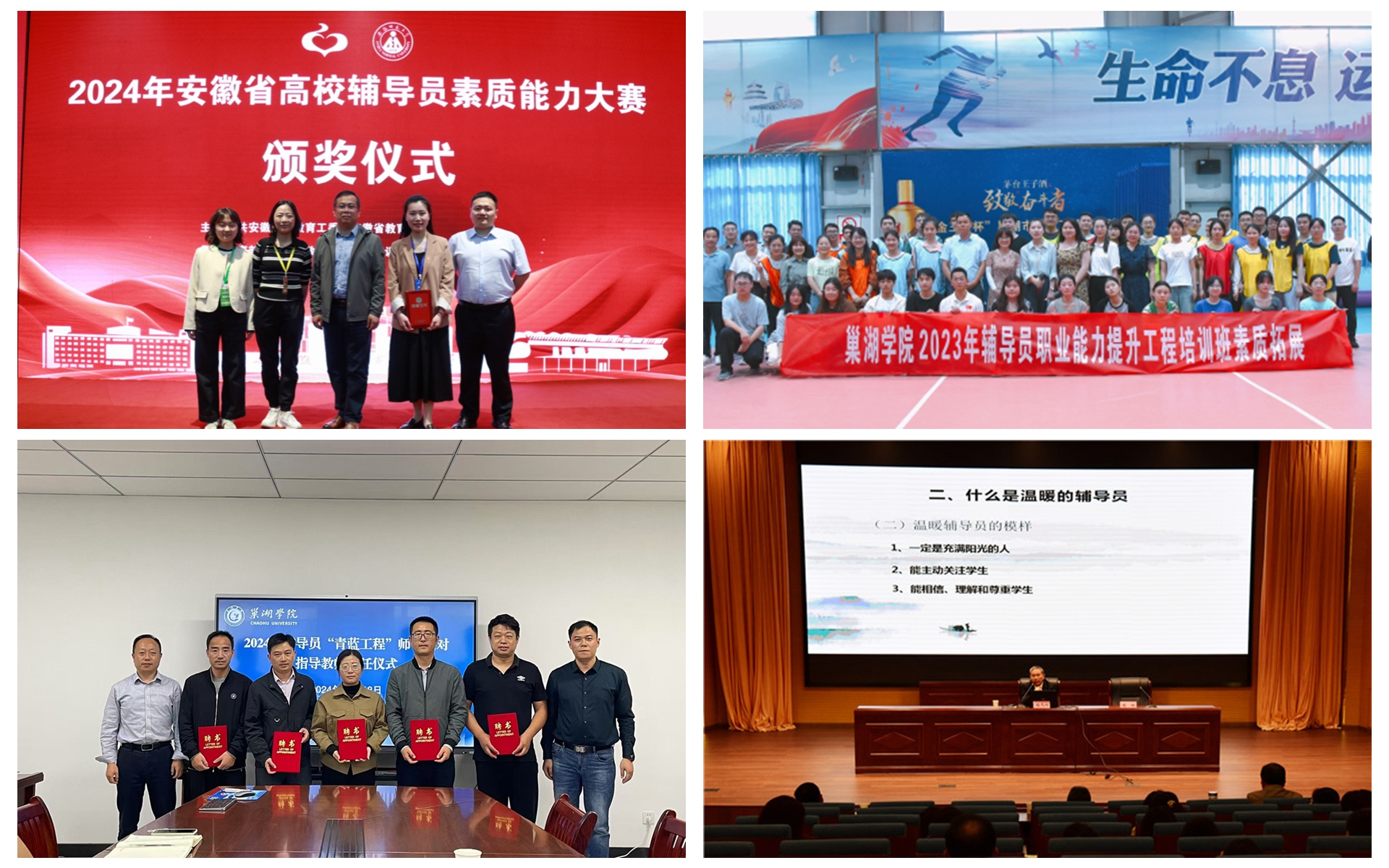 加强辅导员队伍建设,以能力提升保障学生工作扎实有效。一是强化辅导员素质能力提升。以专业化发展、科学化管理和业务能力提升需求为导向,完善分层次、多形式辅导员培训体系,持续推进辅导员队伍向职业化、专业化建设。开展辅导员“青蓝工程”师徒结对和辅导员工作室建设培育工作,开展辅导员素质能力提升工程系列培训,邀请全国模范教师路丙辉、全国最美辅导员杨建等校内外专家作专题报告30余场,选派辅导员参加线上线下各类业务能力培训500余人次;举办辅导员发展论坛、开展辅导员主题班会公开课、就业指导示范教学课,持续提升辅导员队伍素质能力。二是完善激励保障措施,畅通辅导员职业发展路径。落实辅导员队伍双线晋升要求,专业技术职务评聘单列计划、单设标准、单独评审,近三年,1人晋升为副教授,27人晋升为讲师,12人晋升为科级辅导员。1人获安徽省“高校辅导员年度人物”提名,3人在安徽省高校辅导员素质能力大赛中获二、三等奖。2人获批省级辅导员名师工作室,1人获批网络名师支持计划,6人获得安徽省高校思政能力提升综合改革项目立项。