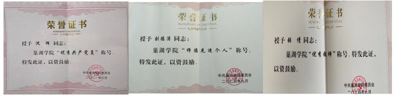学院大力弘扬教育家精神,紧紧围绕立德树人这一根本任务,深入学习“人民教育家”“时代楷模”、新时代教书育人楷模、优秀教师、模范教师、最美教师等先进事迹。近年来,学院2人获得省级“线上教学新秀”,20余人次获得校级“师德先进个人”“优秀教师”“优秀教育工作者”等荣誉称号,1名教师的先进事迹入选学校师德先进案例,1名教师获得校级“我心目中的好老师”,1人获得巢湖市“同心奋进跟党走”先进个人等荣誉。