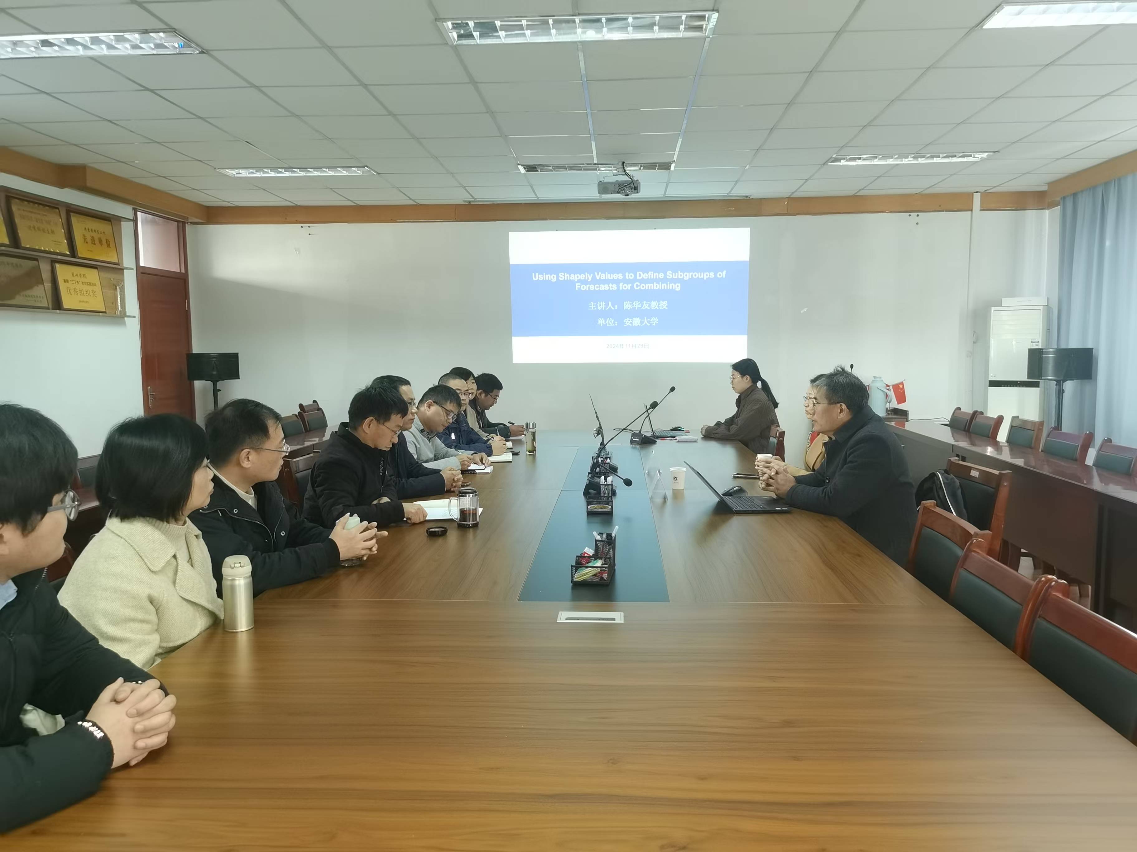 下午,陈华友教授在笃行楼203会议室作主题为“Using Shapely Values to Define Subgroups of Forecasts for Combining”的学术报告。报告基于组合预测问题,提出了一种基于Shapley值方法的算法。陈华友教授的报告内容丰富,思路新颖,讲解深入浅出,详细介绍了问题的背景、思路的引出、方法的分析、模型的构建,将取得的最新有关组合预测方法的成果做了精彩的汇报,报告后并同与会老师就项目申报、学术论文写作等进行交流和指导,与会人员都深受启发。(文/韩欣妍 图/数学与大数据学院团委 初审/郝江锋 终审/陈小波 发布/崔苏如)