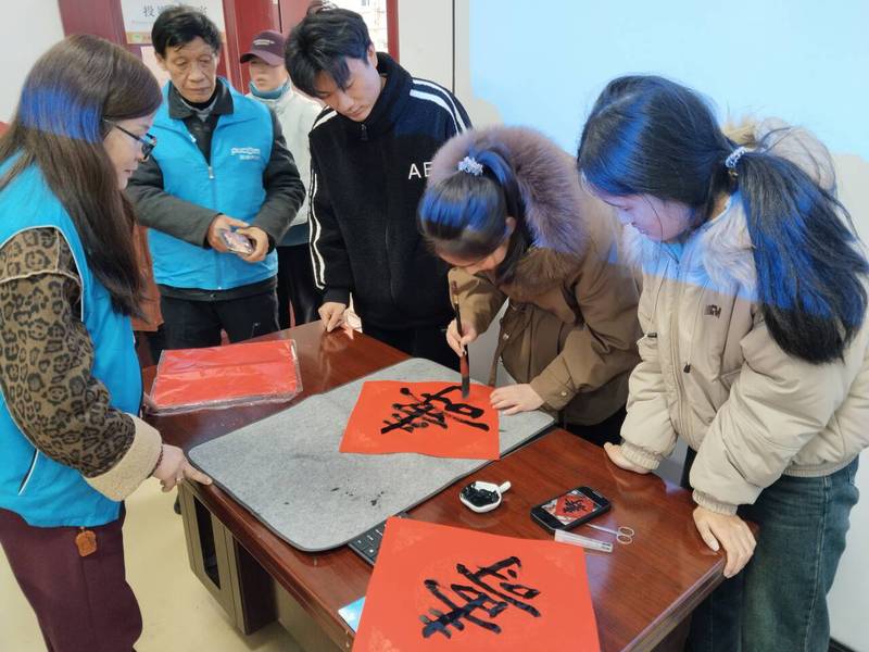 志愿者们还陪伴老人开展剪纸活动,大家或是精心折叠彩纸,或是小心翼翼裁剪,剪刀在纸间穿梭,一幅幅精美的剪纸作品诞生,有象征吉祥的动物,还有寓意美好的花卉,大家脸上都洋溢着喜悦。志愿者们发挥书法特长,铺开宣纸、研好墨汁,挥毫泼墨书写饱含祝福的对联与福字,现场气氛其乐融融。
