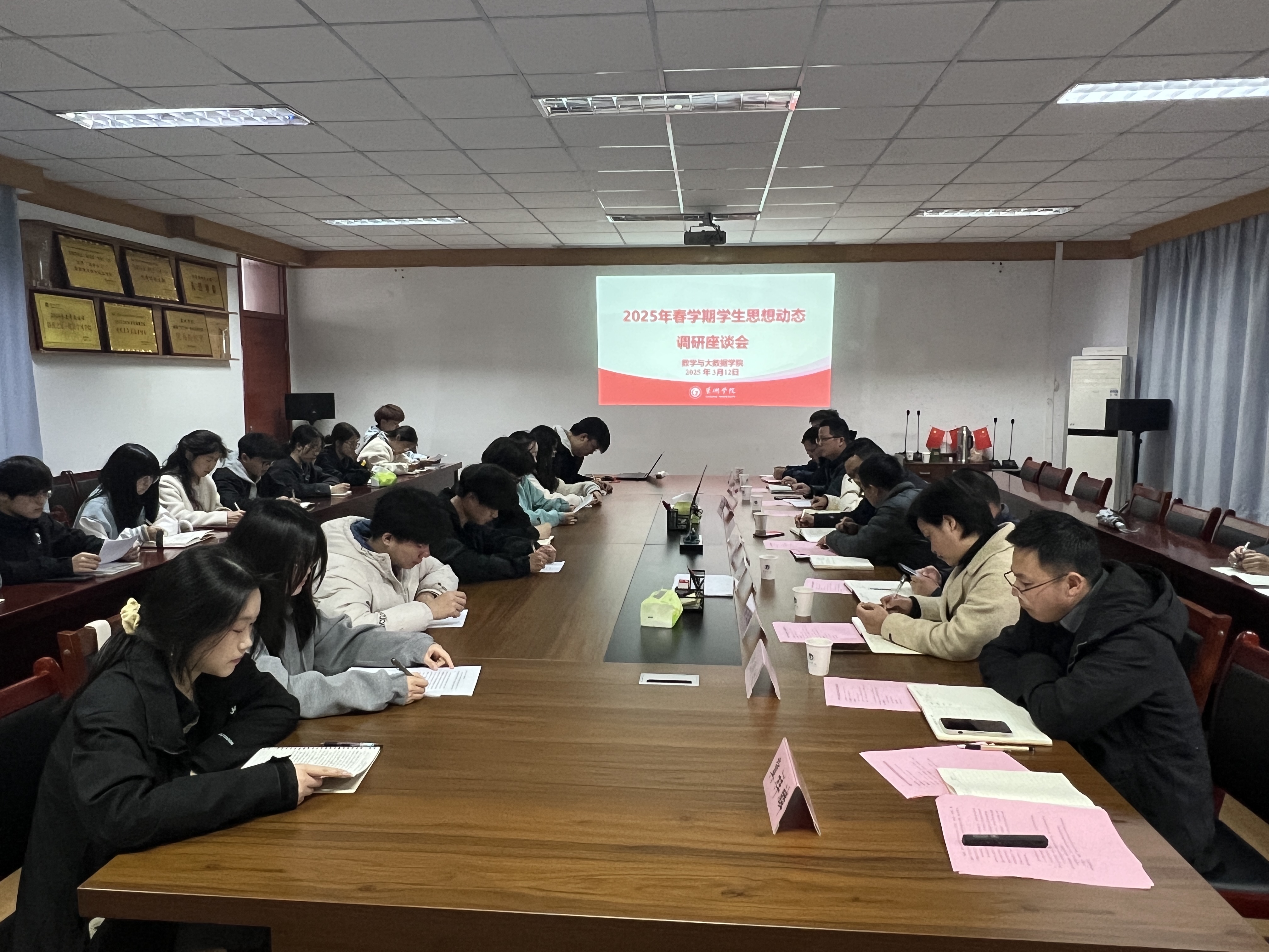 为精准把握学生思想动态,落实立德树人根本任务,提升教育教学质量,3月12日,数学与大数据学院在笃行楼203会议室召开2025年春学期学生思想动态调研座谈会。数学与大数据学院党委副书记(主持工作)陈小波,党委副书记、纪委书记郝江锋,辅导员、班主任和各班学生代表参加。会议由数学与大数据学院团委副书记冀祥麟主持。