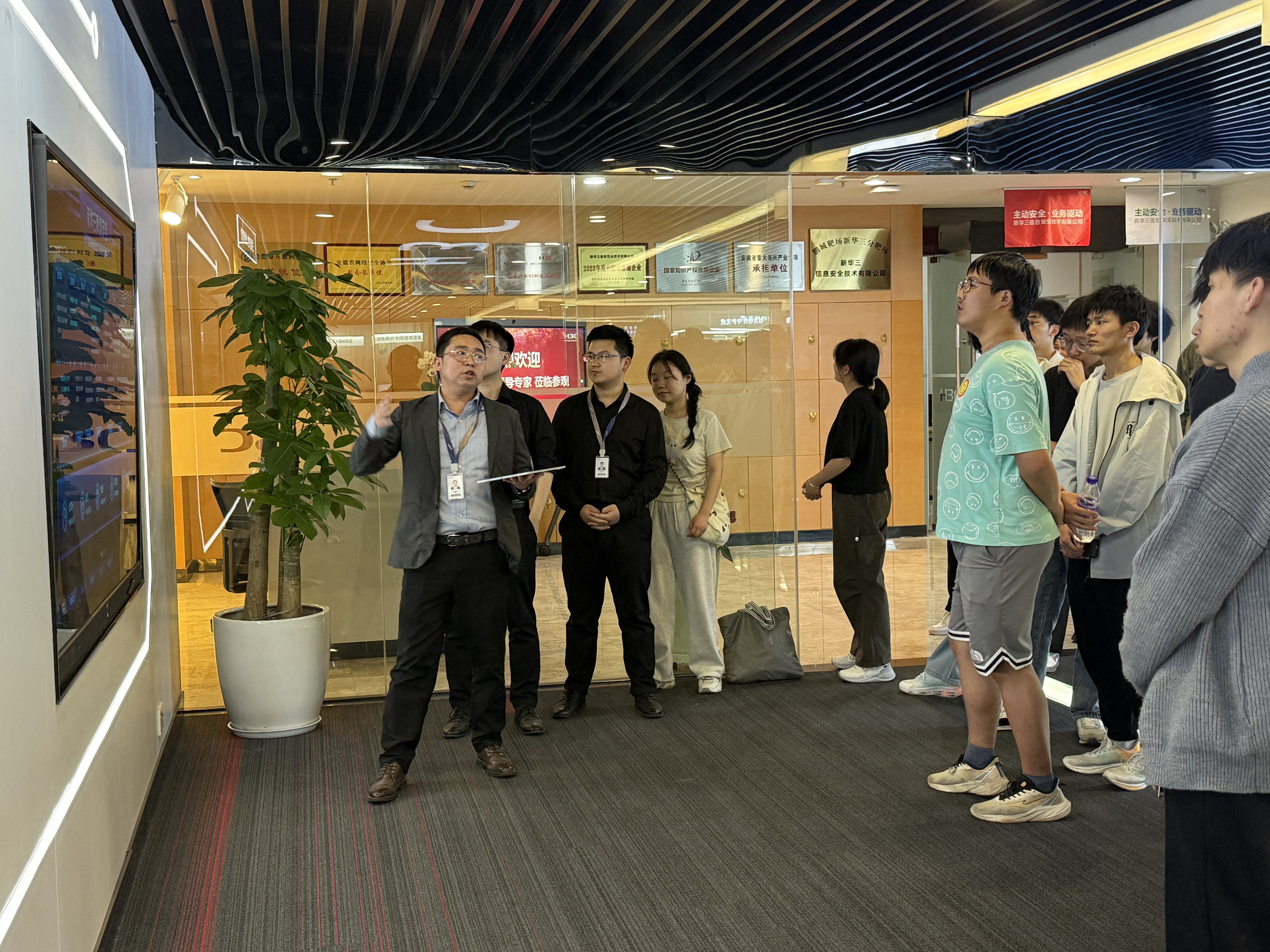 2025年3月26日下午,为了让学生更好地理解专业知识,明晰未来职业方向,计算机与人工智能学院组织了一场认知实习活动,由学院教师带领2024 级网络工程专业全体学生前往合肥新华三信息安全技术有限公司(以下简称“新华三”)进行深入学习。