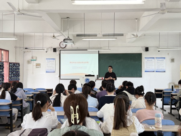活动伊始,管成功围绕当前就业形势、国家及地方出台的就业创业政策进行了全面且深入的解读。他指出,在当前竞争激烈的就业市场中,同学们需要充分了解政策导向,把握机遇。在就业方面,国家积极推动政策性岗位招录招聘,招录招聘时间也整体提前,为高校毕业生提供了更多稳定的就业选择。对于有创业意愿的同学,政策支持力度也是不断加大。为让同学们更好地理解和运用这些政策,管成功结合学校往届生实际案例进行了详细分析,并分享了求职技巧、创业经验等实用内容。同学们认真聆听,不时记录重点。