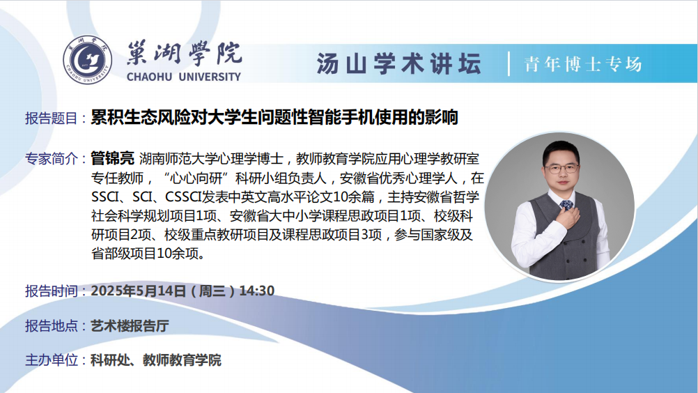 汤山学术讲坛青年博士专场第7讲:(5月14日:教师教育学院管锦亮博士讲座)