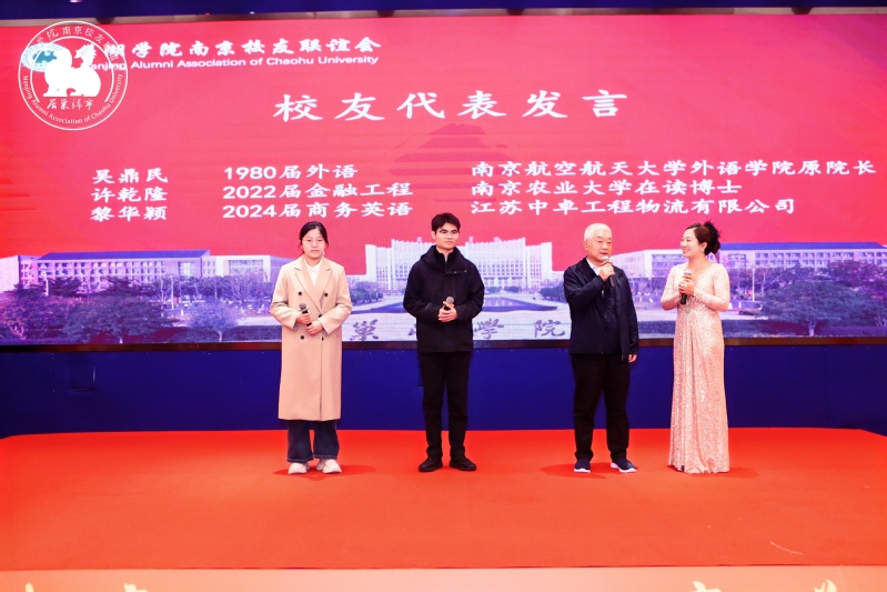 在随后的校友代表分享环节,南京航空航天大学外语学院原院长、1979届英语专业校友吴鼎民,南京农业大学在读博士、2022届金融工程专业校友许乾隆,江苏中卓国际物流有限公司职员、2024届商务英语专业校友黎华颖三位校友结合自身经历,深情回忆母校岁月,尽管年级不同、行业各异,但“华体会hth在线登录人”的共同身份让大家瞬间拉近了距离。会场内始终洋溢着温馨、热烈、感人的气氛。