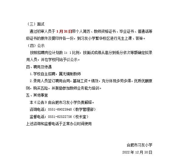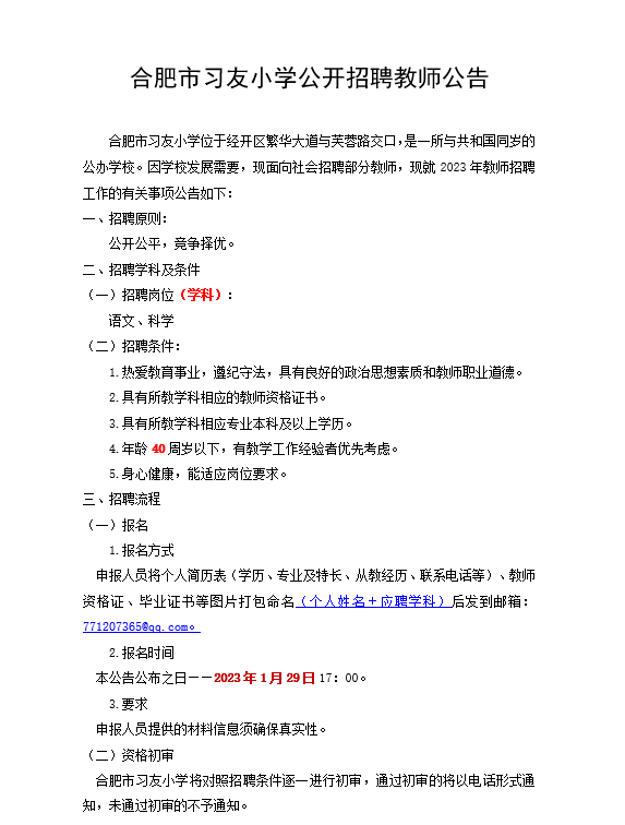 合肥市习友小学公开招聘教师公告