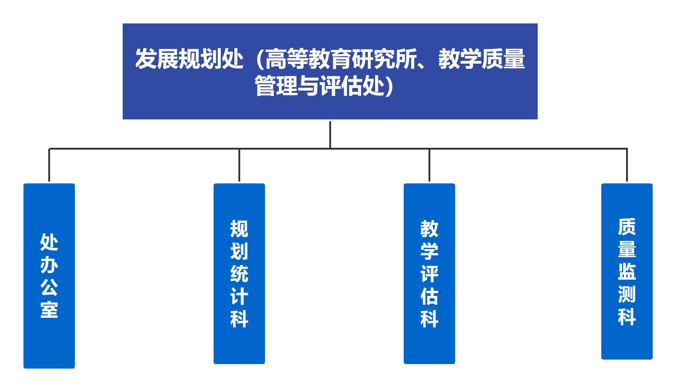 发展规划处是在校党委、行政领导下,研究、编制学校宏观性、战略性、综合性发展规划,并督促其执行与落实,同时为学校重大改革和决策提供决策依据的行政部门。内设办公室、质量监测科、规划统计科、教学评估科四个科室。工作职能为:负责学校事业发展规划编制和落实工作;负责学校事业发展及其目标任务的落实和评估工作;协同做好学校综合性改革方案制定和落实工作;负责章程制定、修订和实施工作。负责学校教学质量文化建设、教学质量保障体系建设和教学质量监测工作;负责学校本科教育教学评估和专项评估工作的组织和实施;负责综合统计和教学基本状态数据采集工作。开展高等教育研究工作。落实上级主管部门和学校交办的其他工作。