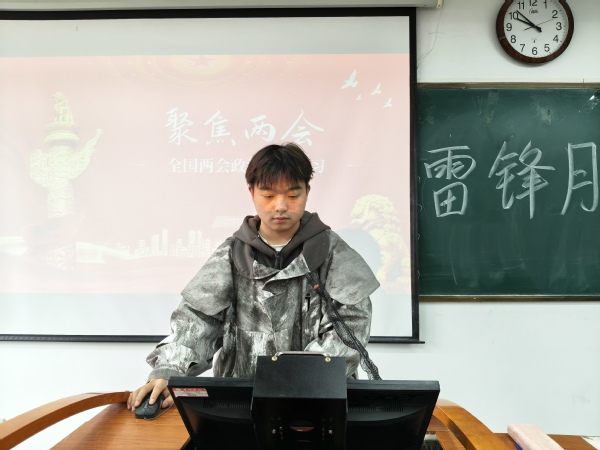 首先,李梦雨带领同学们深入学习领会全国两会精神,强调同学们要忠于党、忠于国家、忠于人民、忠于社会主义。接着,周健邀请班级同学们踊跃上台,共同围绕雷锋的生平事迹和卓越贡献,分享那些感人至深的雷锋故事,在众多分享中,张梦雅同学对“钉钉子”精神的深刻诠释尤为令人动容。随后,同学们在雷锋精神的感召下,纷纷以助人为乐和“钉钉子”精神为主题,进行诗歌创作,用诗句传达了对奉献精神的赞美和追求。最后,周健鼓励大家要加强对劳动和集体观念的认识,并身体力行地组织了一次整理寝室内务的活动,以此实际行动来践行雷锋精神,培养良好的生活习惯和集体主义精神。
