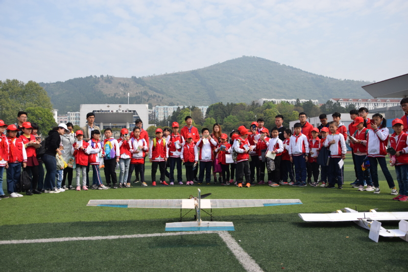 小记者们来到操场上,观看水火箭发射和航模表演。小记者们看到水火箭从发射架上迅速发射出去,腾空而起,又平稳降落,惊奇不断。水火箭刚刚落下,两架航模飞机在操场上空不断盘旋,激发了小记者们的热情。表演结束,小记者们纷纷拿起笔和纸跑上前围着大哥哥大姐姐们积极提问。“水火箭是根据什么原理制作的呀?”“航模和天空上的飞机是一样的吗?”航模协会的同学耐心地回答小记者们的问题。