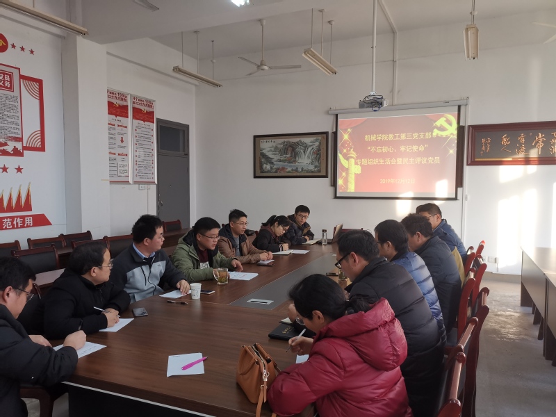 12月12日下午,机械工程学院教工第三支部在学院党员活动室召开“不忘初心、牢记使命”专题组织生活会。全体党员和群众代表参加了会议,会议由支部书记王玉勤主持。学院副院长、副书记汪世义到会指导。