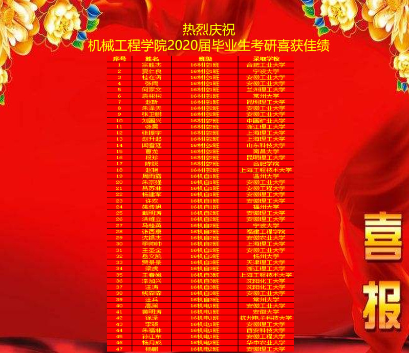 随着2020年全国高校硕士研究生录取工作的完成,机械工程学院2020年考研再创佳绩:学院2020届毕业生共有322人,考研录取47人,升学率达14.60%,较2019年增长1.46%。在升学深造的学生中,录取的省内外高校有合肥工业大学、安徽大学、安徽工业大学、安徽理工大学、中国矿业大学、西安科技大学、天津理工大学、昆明理工大学、南昌大学、宁波大学等。