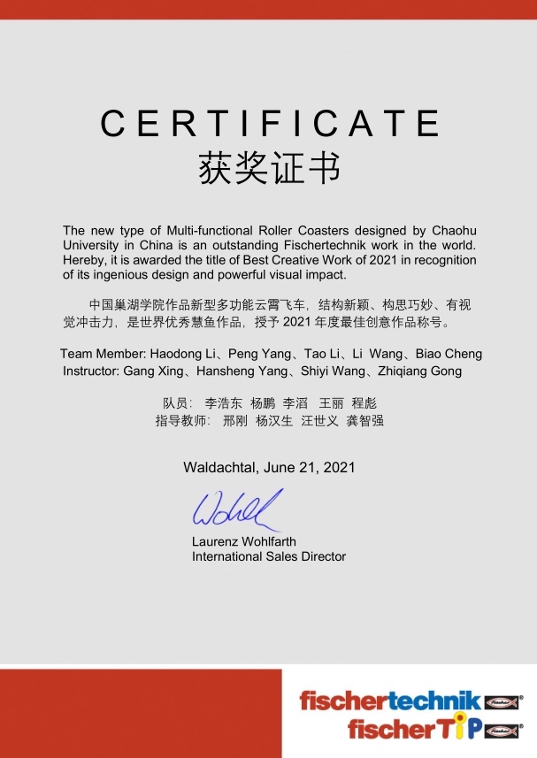 我校机械工程学院李浩东等同学制作的慧鱼作品《新型多功能云霄飞车》,经全国大学生机械创新设计大赛慧鱼组竞赛承办单位——北京中教仪人工智能科技有限公司推荐给德国慧鱼集团,慧鱼集团高层对本作品给予高度评价,认定为世界优秀慧鱼作品,并授予“2021年度最佳创意作品”称号,这是慧鱼集团首次给中国慧鱼作品颁奖,获奖证书上有慧鱼集团全球销售总监Laurenz Wohlfarth的亲笔签名。