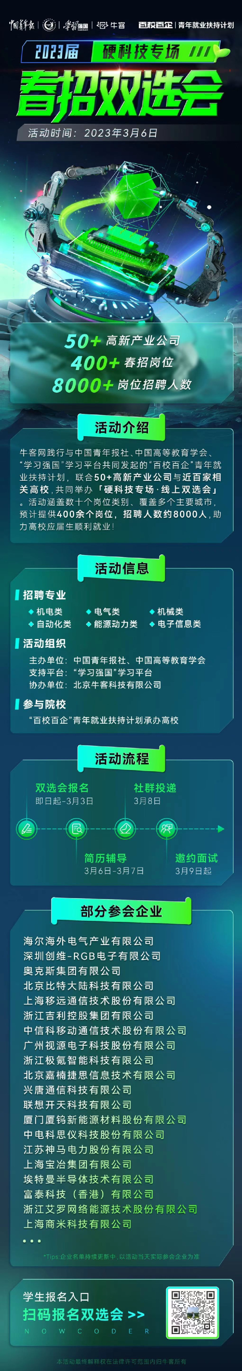 中国青年报“百校百企”青年就业扶持计划,联合50+高新产业公司,特别策划【2023届硬科技专场-春招双选会】,报名入口现已开放!