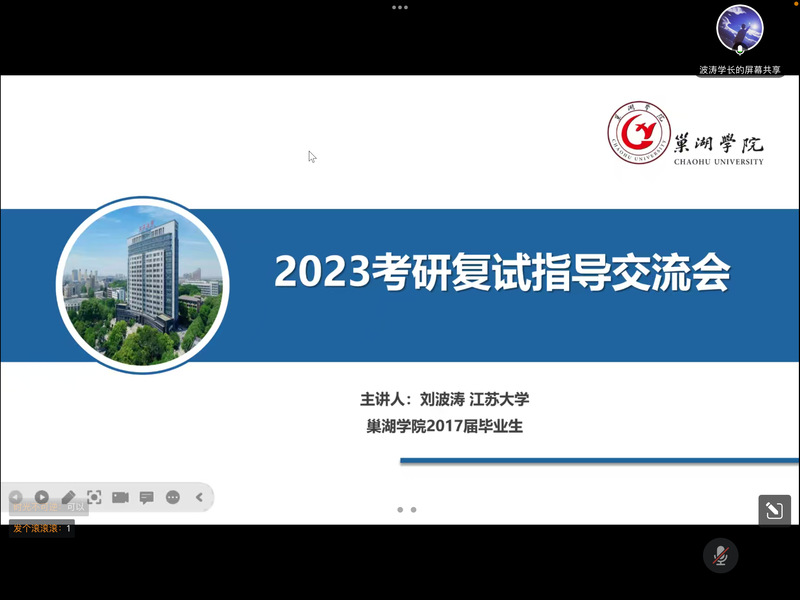 为进一步推进校友工作,充分利用校友资源,充分发挥好“校友朋辈”力量和榜样示范作用,提高考研学子复试及调剂技巧,加强学院学风建设和就业指导工作,2023年3月9日晚上7:00,机械工程学院特邀请优秀校友、现江苏大学辅导员、江苏大学职业发展指导(考研版块)课程主讲教师、思政讲师刘波涛开展考研线上复试及调剂经验分享交流会,学院2023届考研学子参加了此次会议,会议由毕业班辅导员王靖国、方钱老师主持。