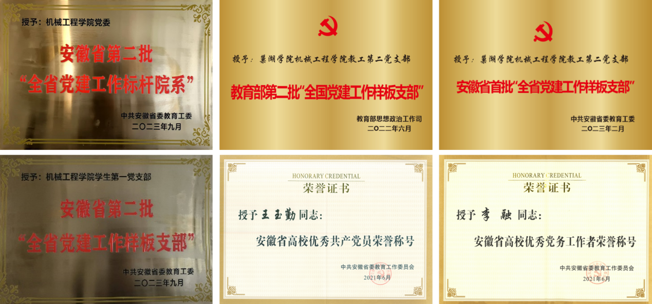 机械工程学院党委始终坚守为党育人、为国育才的初心使命,服务高教强国建设,充分发挥“标杆院系”的示范带动作用,以增强基层党组织政治功能为重点,锻造党支部“战斗堡垒”、激发党员先锋模范,强化“党委引领、支部堡垒、党员先锋”三维党建工作,以高质量党建赋能学院高质量发展,结出累累硕果。2023年,学院党委获批安徽省第二批“党建工作标杆院系”培育创建单位;2019年,学院教工第二党支部获批全国第二批“党建工作样板支部”培育创建单位,已按期通过结项验收;2024年获批国家级高校“双带头人”教师党支部书记“强国行”专项行动建设项目;2023年学生第一党支部获批安徽省第二批“党建工作样板支部”培育创建单位;党员教师李融、王玉勤分别荣获“安徽省高校优秀党务工作者”和“安徽省高校优秀共产党员”称号。
