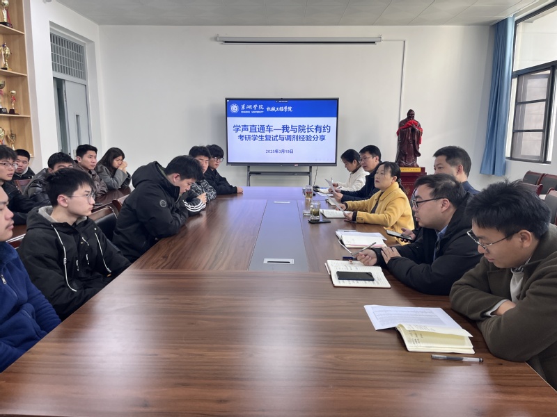 为帮助学院2025届考研学子复试,助力学生迎战“最后一公里”,机械工程学院于2025年3月19日举办第五期“学声直通车”——我与院长有约考研学生座谈会,学院院长许雪艳、副院长张自锋、专业课教师张强强、毕业班辅导员王靖国、方钱以及40多名考生参加会议。会议由学院党委副书记、纪委书记李融主持。