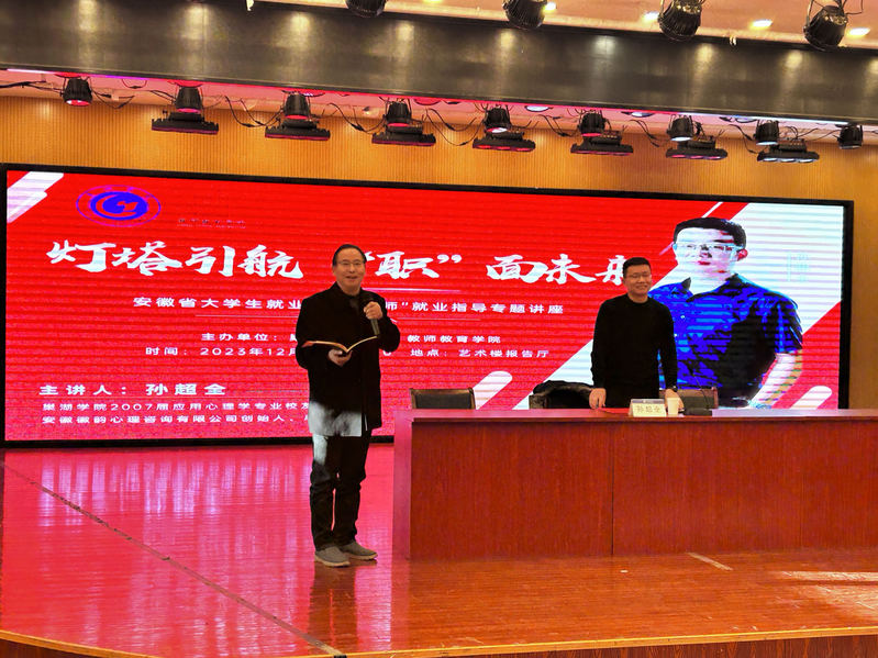 为深入贯彻党的二十大精神和党中央、国务院关于高校毕业生就业工作的决策部署,提升学生就业创业意识和能力,促进毕业生高质量充分就业,12月7日下午,校团委、教师教育学院在艺术楼报告厅举办大学生就业指导专题讲座。安徽省大学生就业“引航导师”、安徽徽韵心理咨询有限公司创始人、总经理孙超全主讲,全校200余名学生现场聆听讲座。活动由教师教育学院党委副书记左劲中主持。