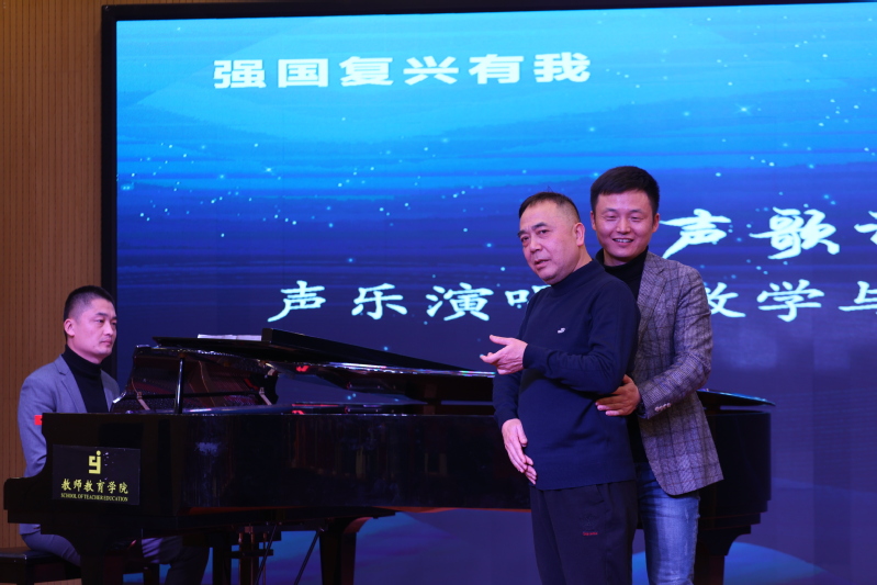 教师教育学院副院长蔡广首先致词,对两位专家的到来表示感谢,并对此次公开课的意义给予充分的肯定。庄云龙老师为大家演唱了三首在今年第十四届中国金钟奖上的获奖曲目,其中一首是巢湖民歌改编的《江南四月车水忙》。接着他分享了十年金钟奖筑梦历程。庄云龙老师以精湛的演唱,娓娓道来曲折励志的追梦之路,赢得了在场听众数次热烈的掌声。邝实教授将多年来积累的教学与实践经验进行分享,以生动有趣、深入浅出的授课方式与六位学员进行了现场指导和互动,使师生们受益匪浅。