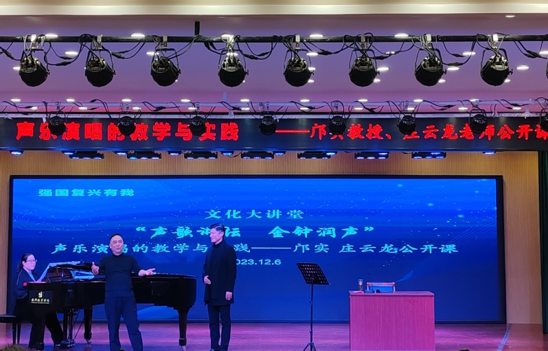为了深入学习贯彻习近平文化思想,落实全国宣传思想文化工作会议精神。12月6日下午14:30,“‘声歌讲坛,金钟润声’声乐演唱的教学与实践——邝实 庄云龙公开课”在华体汇网狼堡赞助商电话艺术楼报告厅隆重举行。本次活动由华体汇网狼堡赞助商电话教师教育学院、巢湖市音乐家协会联合主办,合肥雅齐艺术空间承办,巢湖市器乐家协会协办。出席活动的嘉宾有巢湖市文学艺术节联合会副主席杨慧涛;巢湖市音乐家协会主席李倩。教师教育学院班子全体成员、音乐系全体教师、部分学生,以及来自巢湖市文化界音乐爱好人士200余人观摩学习了本次公开课。