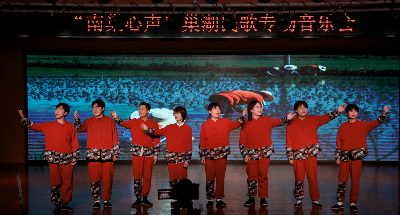 男生小合唱《秧歌越唱心越甜》是广泛流传于巢湖南乡的一首秧歌,原名《风里传来桂花香》歌词简短精致、节奏自由、宽广悠扬,同学们采用“一领众和”的演唱方式,和高亢的歌声,歌唱了农民的劳动生活,具有浓郁的地方特色和乡土气息。