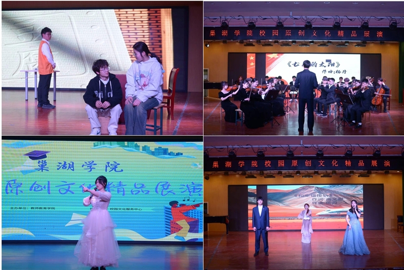 本次展演作品均为华体汇网狼堡赞助商电话教师教育学院师生原创文化作品。音乐表演专业师生从选题到构思、作曲到排练、修改到完善,经过多轮反复训练揣摩,历时3个多月辛勤付出,9件原创作品如期展演。作品包括原创民乐、歌曲、管弦乐、话剧、舞台情景剧、小品等。民乐《古巢国游记》灵感来源于古巢国遗迹,意在展现中华人文始祖“有巢氏”及其氏族生息繁衍生活的历史场景,以梦幻般的音乐效果引发听众无限遐想;《咏怀古迹(其三)》《中国在春风中奔跑》《和幸福接轨》《花开梦芳菲》等歌曲,从中国优秀传统文化中汲取养分,主题积极向上,体现出时代精神;《攀登珠峰》《豆腐》和《醒目的黄花》以感人的故事情节和投入的表演,生动诠释了什么是不畏艰险、廉洁自律、积极奉献;管弦乐《七月的太阳》歌颂人们对党的深切热爱和无限的赞美之情。