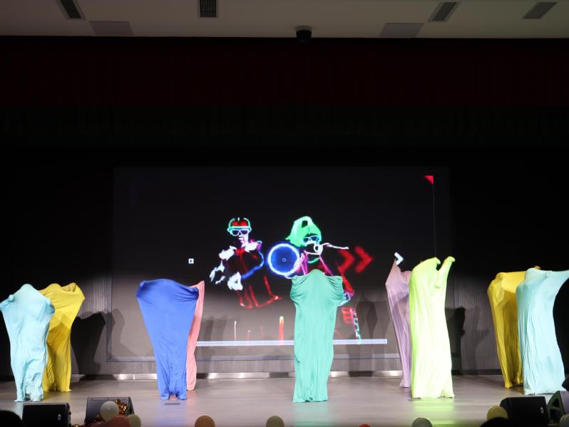 舞蹈《彩影舞韵》中一群彩色的小人如同灵动的精灵,在舞台之上翩翩起舞,他们的每一个舞步,都似跳动的音符,奏响活力的乐章。