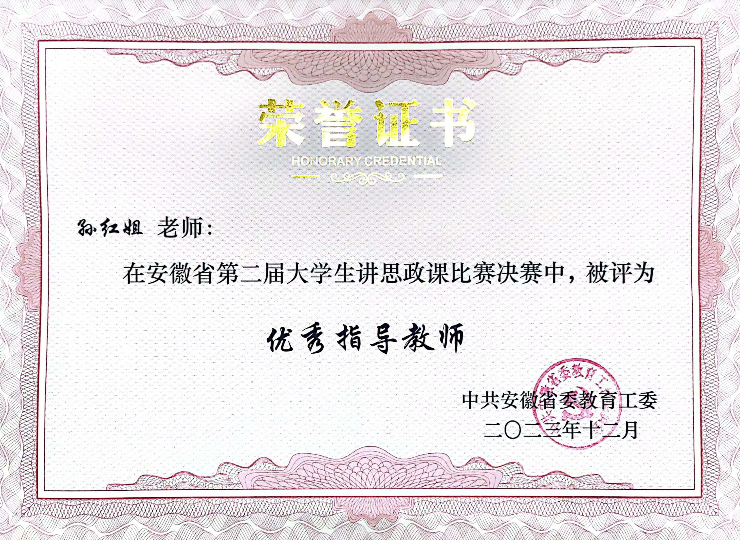 孙红姐在指导“安徽省第二届大学生讲思政课”比赛中荣获优秀指导教师