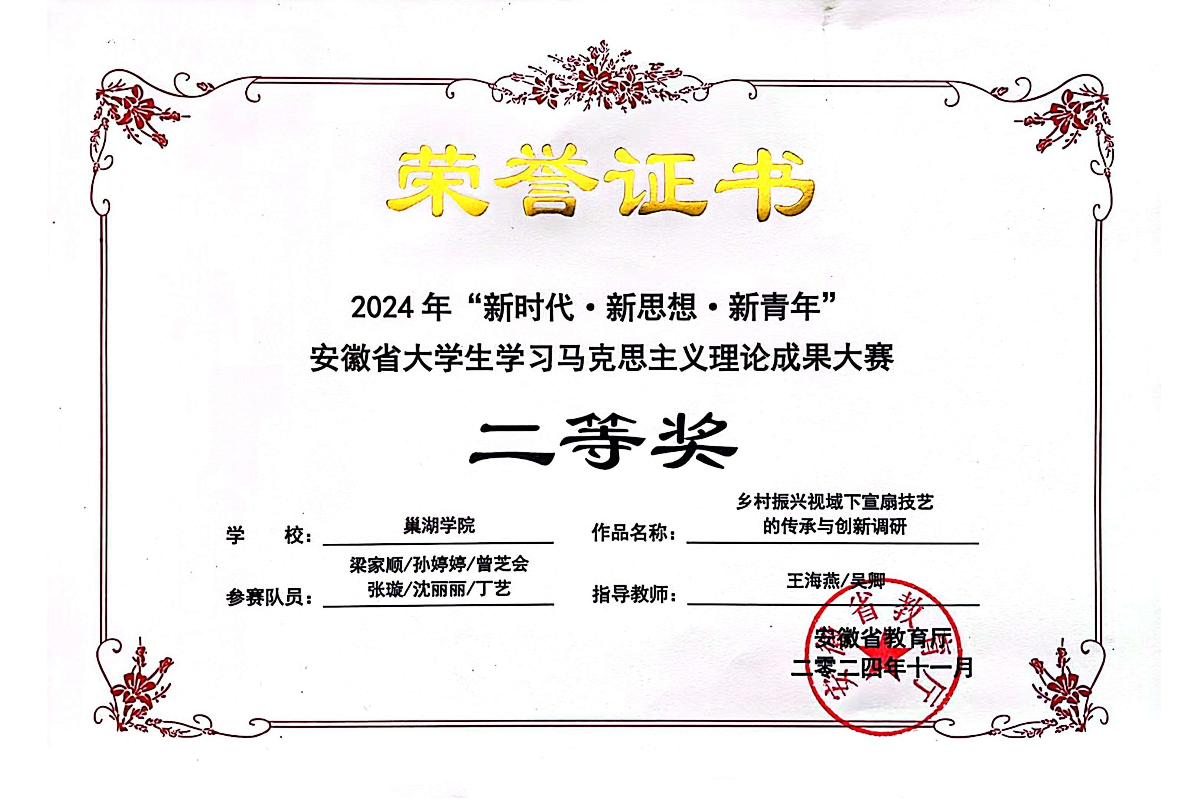 王海燕、吴卿老师指导2024年“新时代·新思想·新青年”安徽省大学生学习马克思主义理论成果大赛调研报告类获二等奖