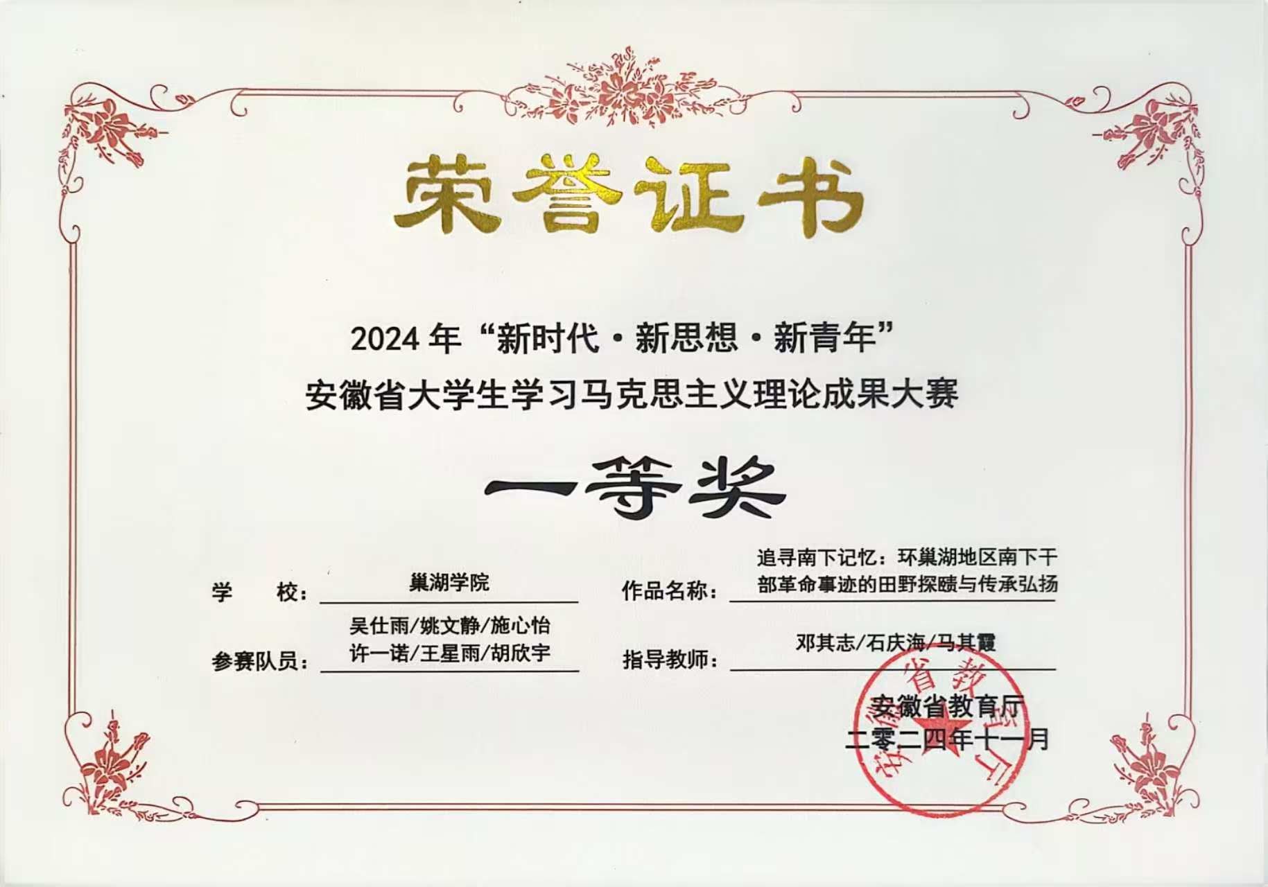 石庆海教师指导学生在2024年“新时代·新思想·新青年”安徽省大学生学习马克思主义理论成果大赛调研报告类评比活动中获一等奖