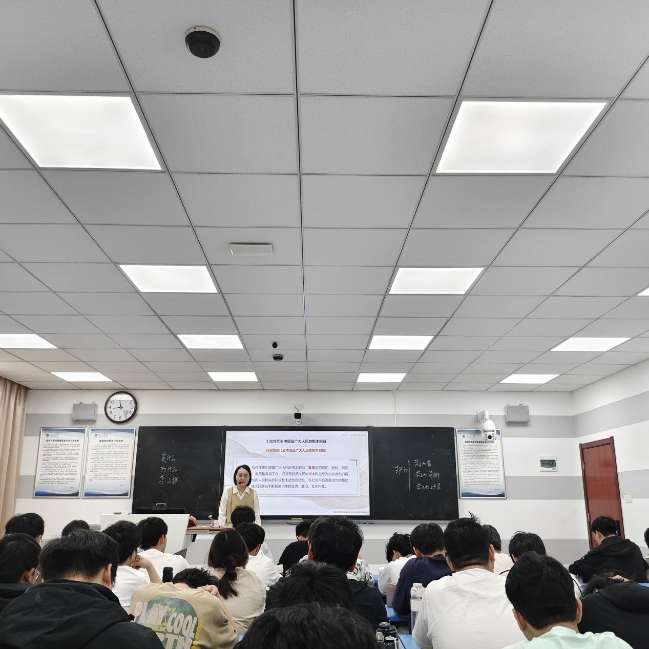 张秀娟老师公开课主题为“中国共产党始终代表中国最广大人民的根本利益”,这一章节是《“三个代表”重要思想》专题的第一部分。张老师的课程以提问和引导学生回答的方式展开,层层递进的向同学们介绍了中国共产党始终代表中国最广大人民的根本利益的理论依据、历史依据和现实依据,揭示了中国共产党在社会主义建设的新时期对马克思主义群众史观的继承和发展。在课堂上,张老师结合多个案例,以学生分析、老师总结的教学方式开展教学互动,调动了同学们课堂参与的积极性,培养了同学们理论联系实际的能力。