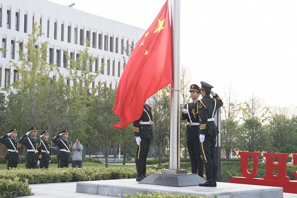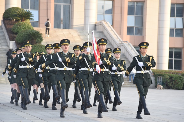 早晨7时,国旗护卫队迈着矫健的步伐,护卫五星红旗走上升旗台。嘹亮的国歌声响起,五星红旗迎风冉冉升起,在场师生行庄重肃穆的注目礼。
