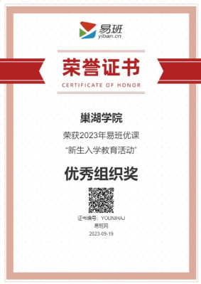 近日,教育部易班发展中心公布了2023年度易班优课“新生入学教育活动”评选结果,我校再次荣获优秀组织奖,裴敏俊、陈荣光荣获优秀指导教师。