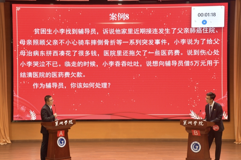 决赛分为“案例研讨”和“谈心谈话”两个环节。“案例研讨”主要考察辅导员综合运用理论分析问题、研判问题、解决问题、应急处突等能力。参赛辅导员赛前抽取分组,以“我提问,你回答”的方式开展,选手们围绕心理危机、网络诈骗、学风建设、校园安全、日常管理等案例主题,把握问题本质,共同辨析原因、研讨对策,并进行总结与启示,充分展示了辅导员扎实的理论知识储备、丰富的工作经验和对学生的深切关心。