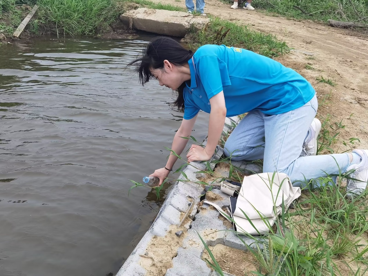 此外,夏乡稻麦小队赴巢湖槐林镇开展水质检测活动,考察当地的水质环境,政府人员带领团队成员前往湿地,成员们在槐林镇靠近田地的多地水域的不同位置进行取水取样,拍照记录所取水样的位置然后贴标签分类。本次所取水样将由夏乡稻麦小队的人员带回学校根据相关要求进行严格检测,调研槐林镇蓝藻季节性爆发问题。在取样的过程中团队成员也与政府相关负责人及当地农民进行交流,了解附近水域的现状以及附近湖水的质量对水稻等农作物的影响,在交流融汇后,成员对于水稻的生长环境着一定了解,做到在确保谷物质量、品质的同时也要保护消费人群。做到维护社会和个人的利益。
