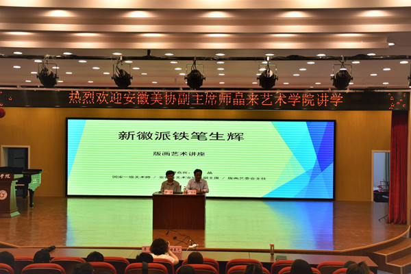 为继承徽派版画的优良传统,迎接第十三届全国美术作品展和第七届安徽美术大展,继4月16日在安徽师范大学举办《安徽版画70年铁笔生辉》和4月17日安庆师范大学美术学院举办的《徽风皖韵版画情》讲座后,5月24日下午,国家一级美术师、安徽省美术家协会副主席、版画艺委会主任师晶,受科技处、艺术学院邀请,在艺术楼二楼多功能报告厅进行了题为《新徽派铁笔生辉》的版画学术讲座。此时正值2019年艺术学院毕业创作展览布展期间,师晶主席的到来为艺术学院艺术展览又增添了一抹色彩。此次讲座由艺术学院院长杨松水教授主持。