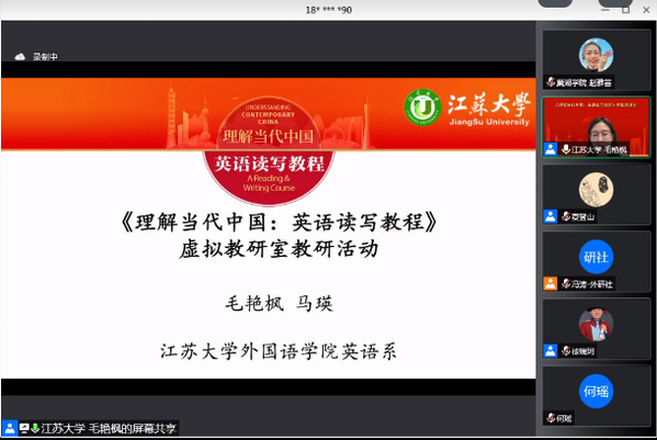 25日19点,《理解当代中国:英语读写教程》研讨活动由江苏大学英语系副主任毛艳枫教授和《英语读写教程》编者、北京外国语大学徐瑞珂副教授主讲。