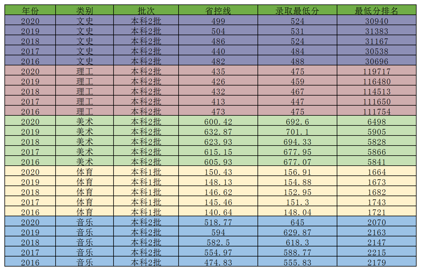 我校各科类2016-2020年在安徽省普通高校招生最低投档分数及名次